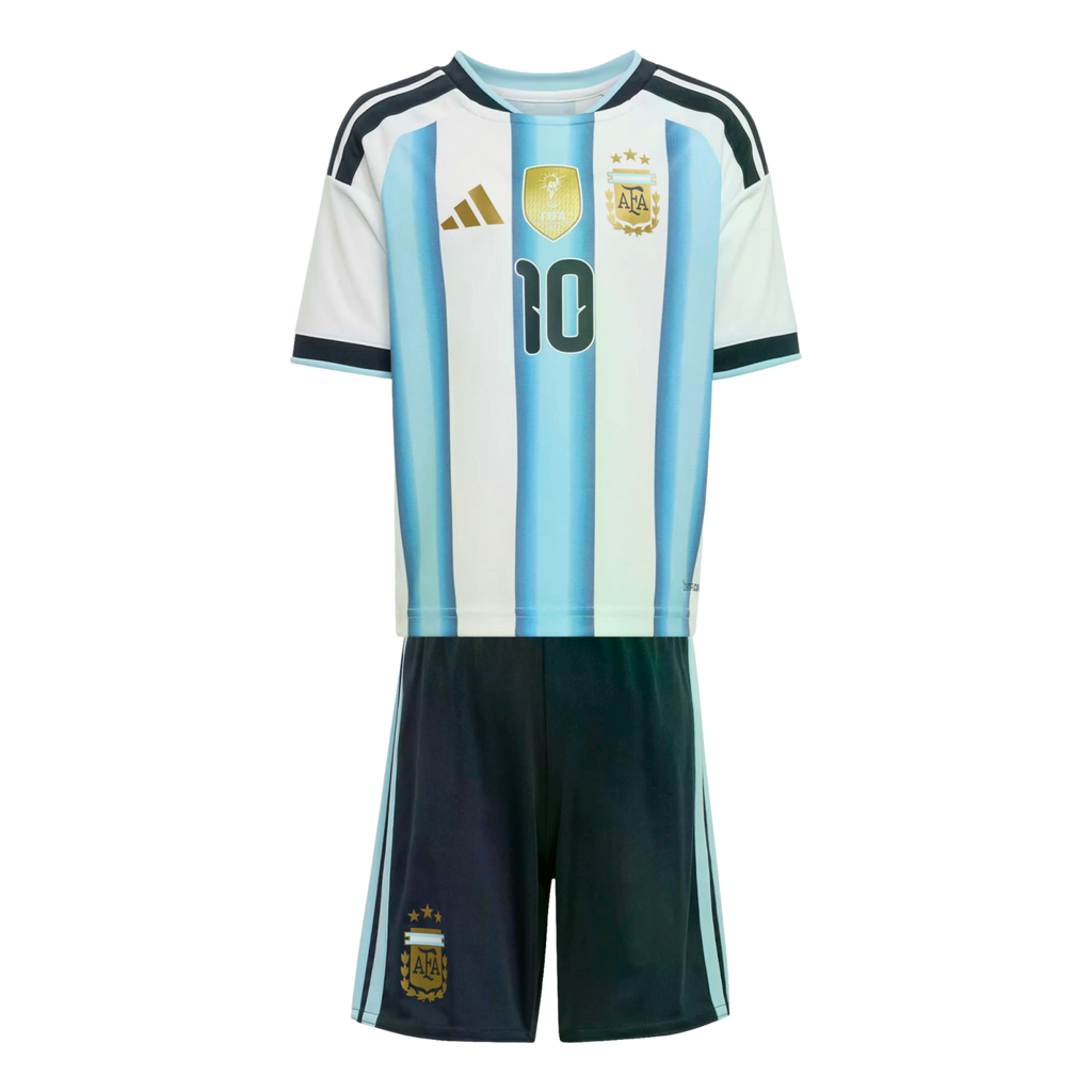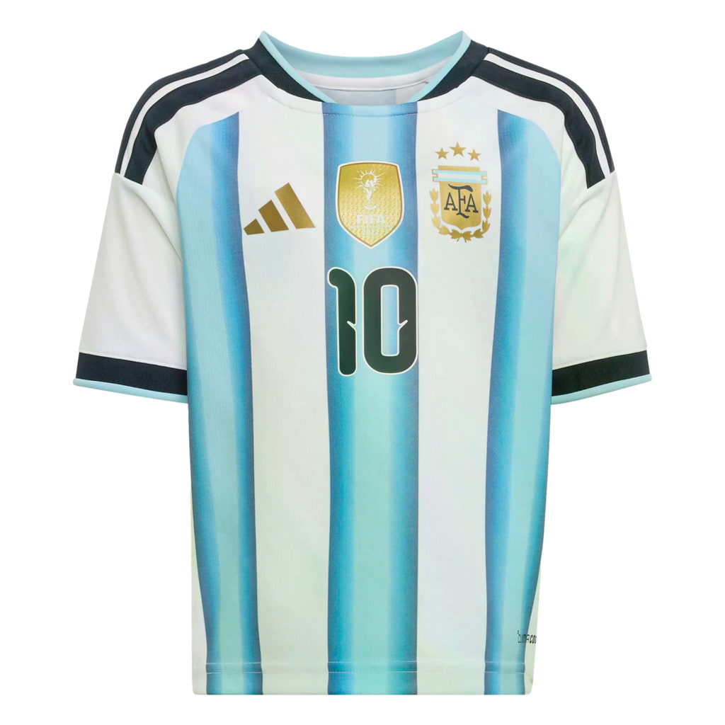 Soccer-loving kids can celebrate Argentina's soccer legacy as they hone their own skills with the Argentina 26 Home Set. This kit from adidas pays tribute to the World Champions and features design elements inspired by Argentina's three World Cup victories. Classic trims, shorts, and socks complete the look in style. Designed for young fans and passionate players, the set incorporates Climacool technology to help keep kids feeling cool and dry during playtime, school activities, or training. Bold heat-transferred 3-Stripes and the club crest highlight adidas branding and Argentina's soccer heritage. Whether it's break time or a friendly game, this kit channels the energy and passion of one of the world's greatest soccer nations.