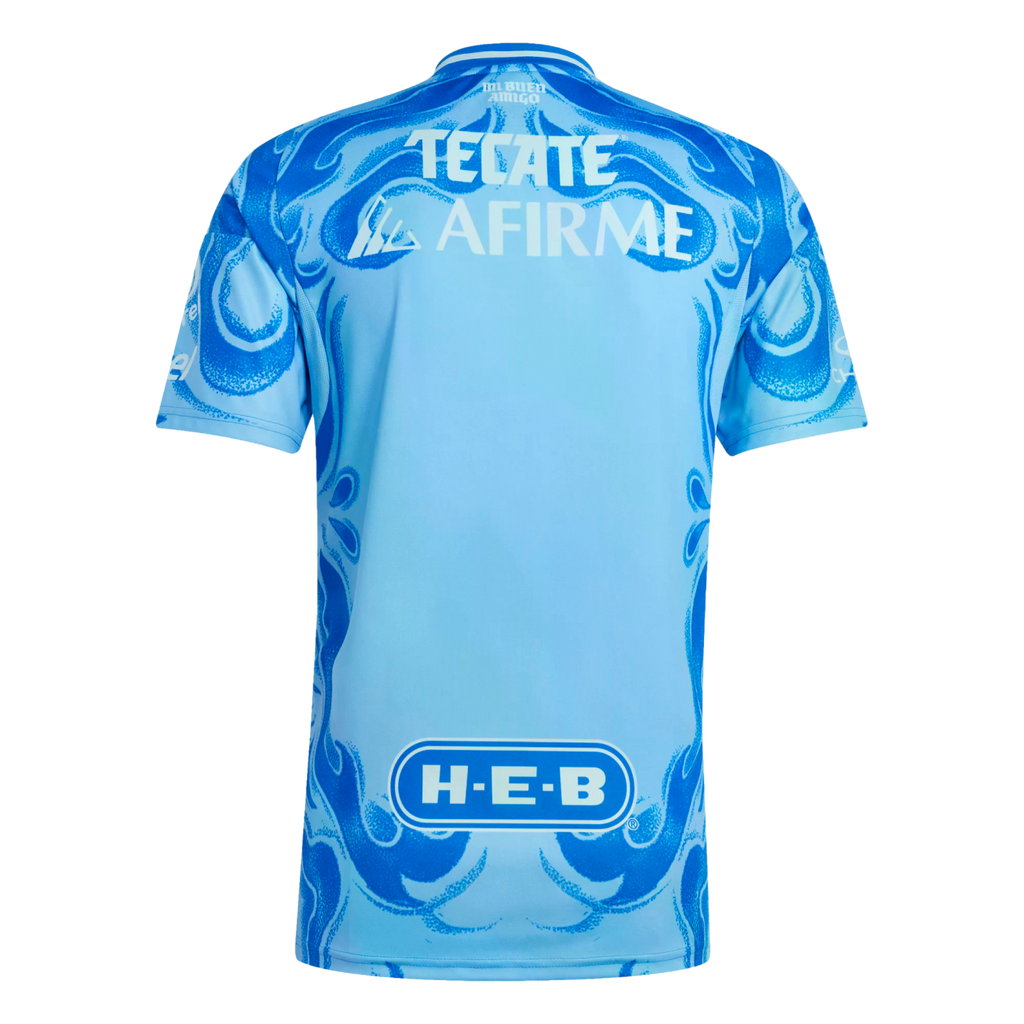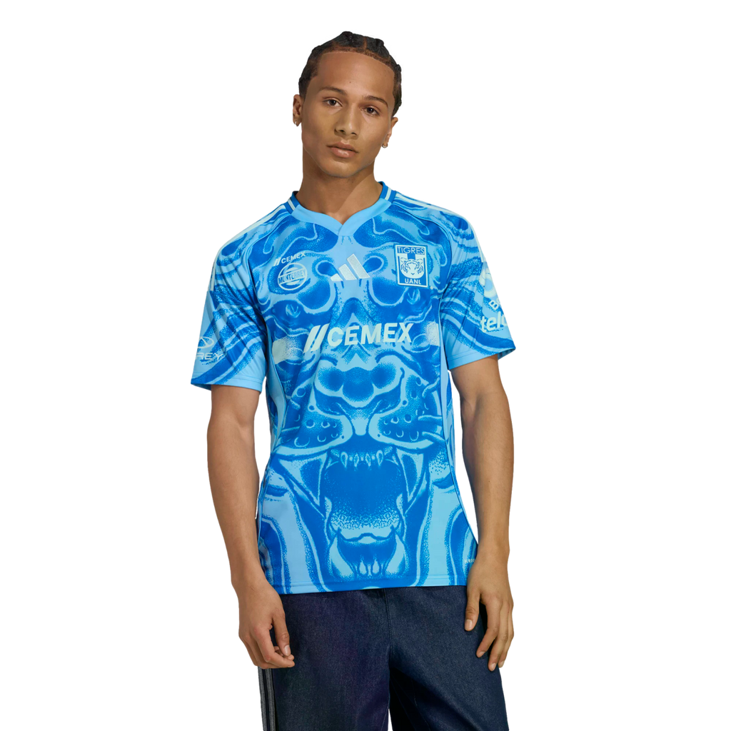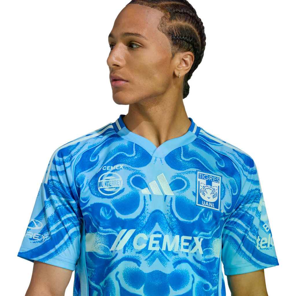 Show your fierce support for Tigres UANL on the road in this adidas away jersey. Inspired by the club's dynamic crest, a tattoo-style tiger graphic stares out from the imposing design. Created to keep fans focused on the soccer, this shirt features moisture-managing AEROREADY. On the chest, a woven team badge completes the ferocious look.