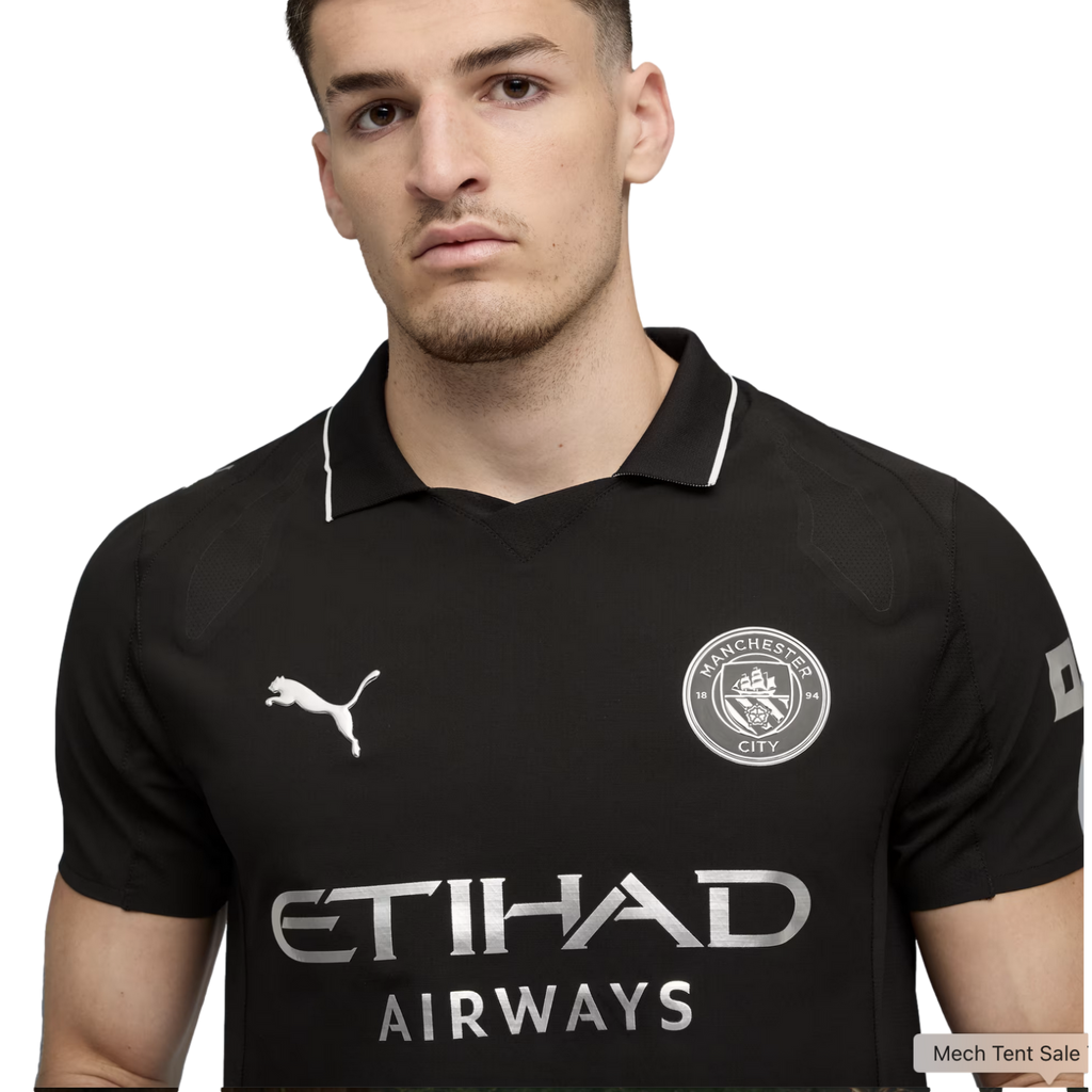 The earliest-known kit in Manchester City’s history dates back to 1884, when the football club was based in Gorton. The 25/26 Away Kit is a tribute to the early Cityzens, reimagined with a nod to the club's innovative spirit. The all-black design takes inspiration from that historic kit, combined with metallic details to celebrate the timeless essence of Manchester City Football Club.