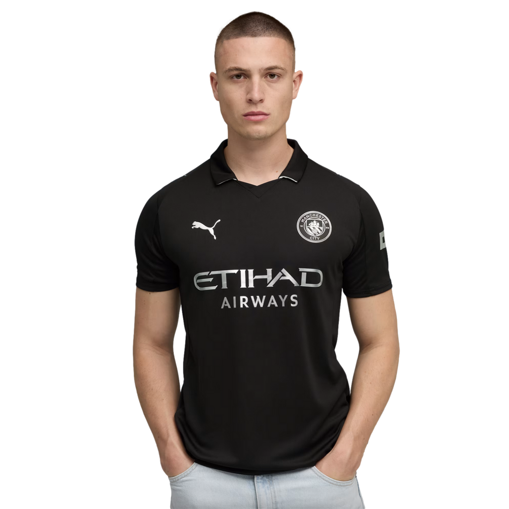 The earliest-known kit in Manchester City’s history dates back to 1884, when the football club was based in Gorton. The 25/26 Away Kit is a tribute to the early Cityzens, reimagined with a nod to the club's innovative spirit. The all-black design takes inspiration from that historic kit, combined with metallic details to celebrate the timeless essence of Manchester City Football Club.