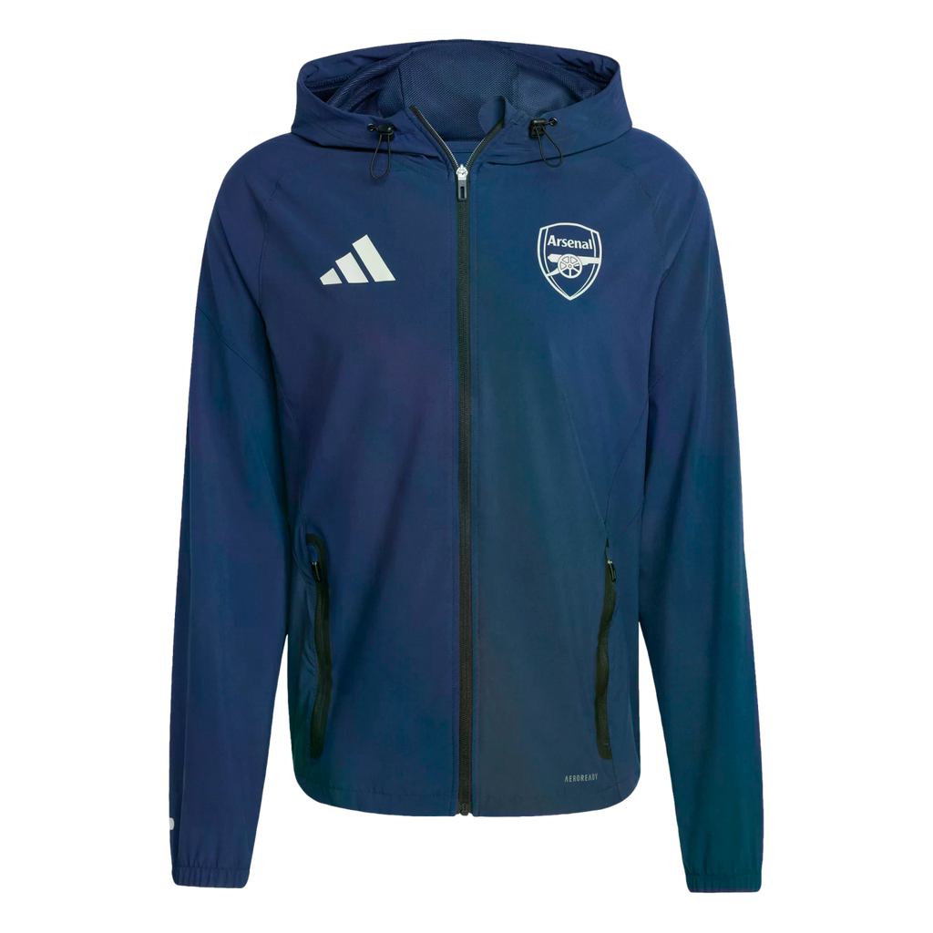 Travel in style and show your support for Arsenal wherever you roam. This adidas Tiro 25 soccer jacket combines performance and team pride. Stretchy fabric makes movement a breeze and AEROREADY manages moisture to keep you comfortable. That club badge on the chest is done in reflective print so everyone knows who you back on the field.