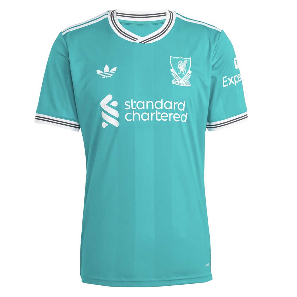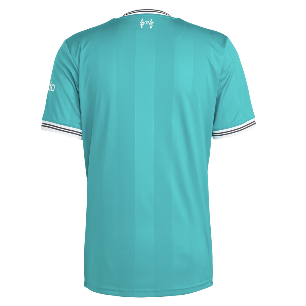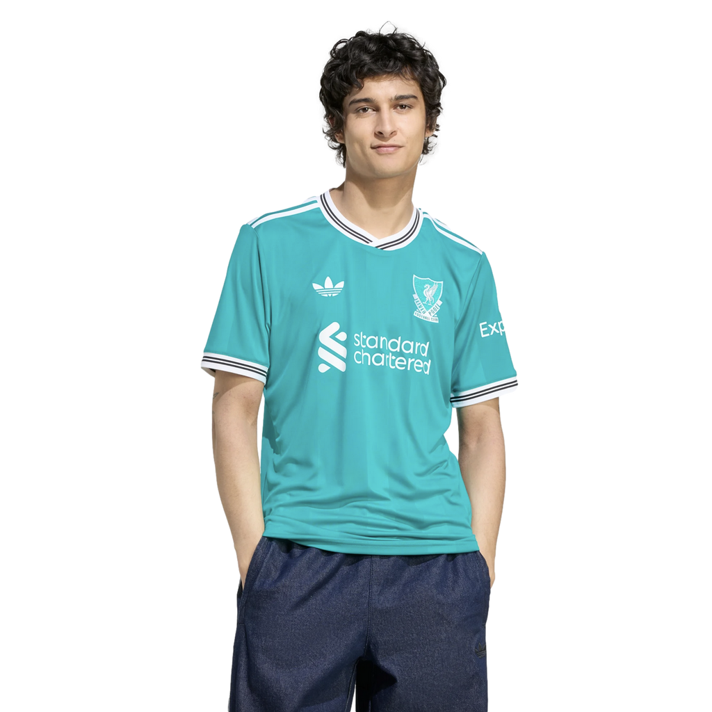 A modern soccer classic inspired by Liverpool FC's storied 3-Stripes history. The tonal vertical stripes on this elegant third jersey come in unmistakable adidas Equipment green. On the chest, that vintage club badge shares the spotlight with a Trefoil for the first time since 1991. Created for traveling Reds, this shirt includes moisture-managing AEROREADY so it feels as good as it looks.