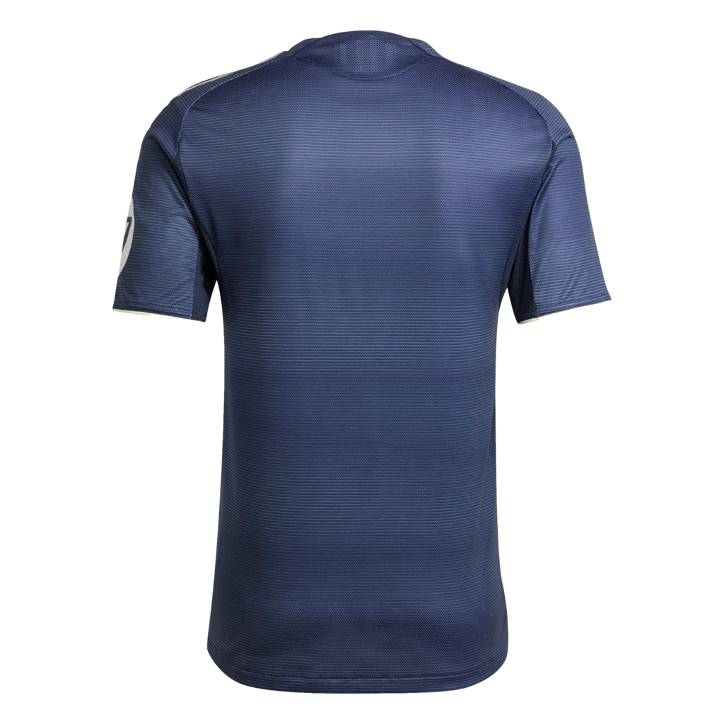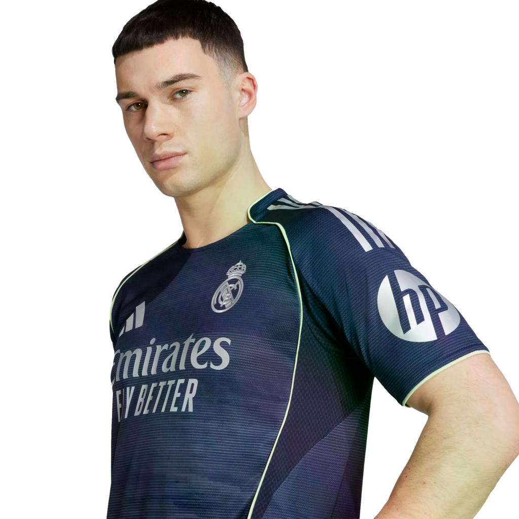 As Real Madrid's world-famous stadium enters a brand-new era, this adidas away authentic jersey pays tribute to magical nights at the Santiago Bernabéu. Its moiré effect print and silver metallic details combine to mimic the gleaming facade of the renovated arena. The performance-focused construction ensures the club's players feel an advantage at away grounds as well as at their legendary soccer home.