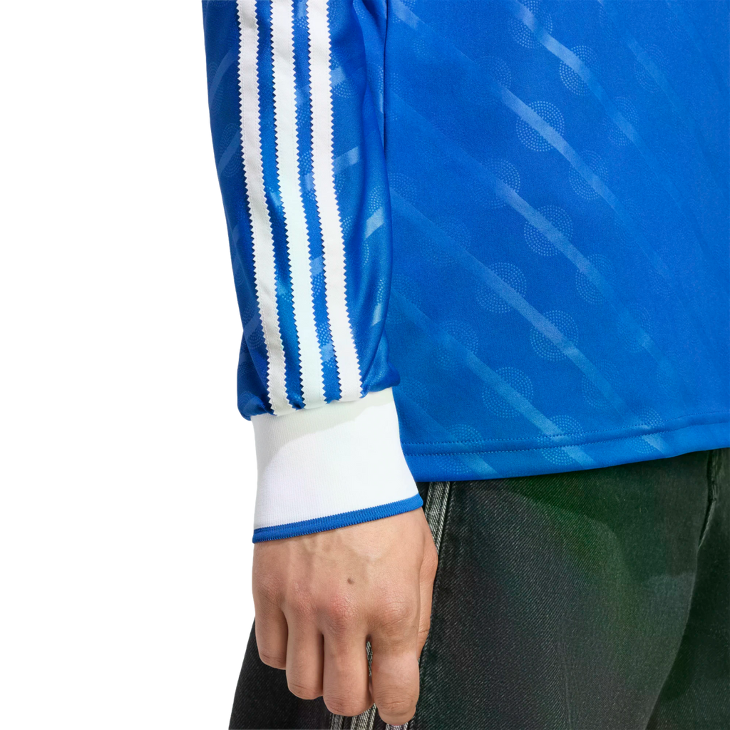 At home in blue. This long sleeve third jersey comes in a hue that's close to the hearts of Madridistas and 3-Stripes fans. A classic adidas Originals colorway and a subtle nod to the Bernabéu's identity, it's the perfect shade to celebrate the ultimate soccer partnership. Serrated 3-Stripes and a Trefoil add extra adidas heritage. Moisture-managing AEROREADY keeps fans focused.