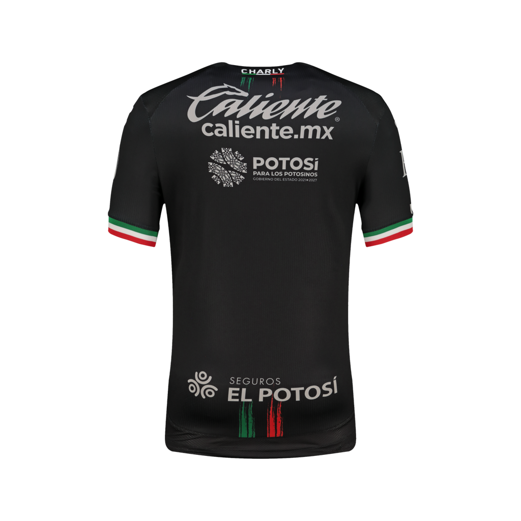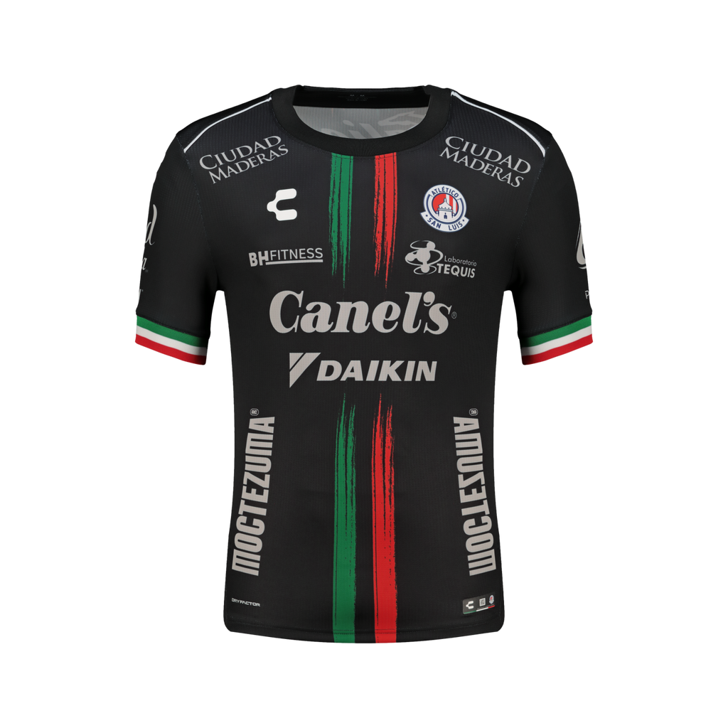 Potosí pride is embodied in the colors of a nation. The  Atletico San Luis Away Jersey celebrates the passion for Mexican football with a design that fuses strength, character, and emotion. This special edition represents the strength of a club that defends its crest with the same pride with which it wears the colors of Mexico. Its elegant black design is enhanced with green and red stripes that evoke passion, tradition, and determination, achieving a perfect balance between modernity and football essence. The classic sleeve with tricolor ribbing and the round neck with black ribbing and white piping add a distinctive and sophisticated touch, ideal for standing out on any occasion.