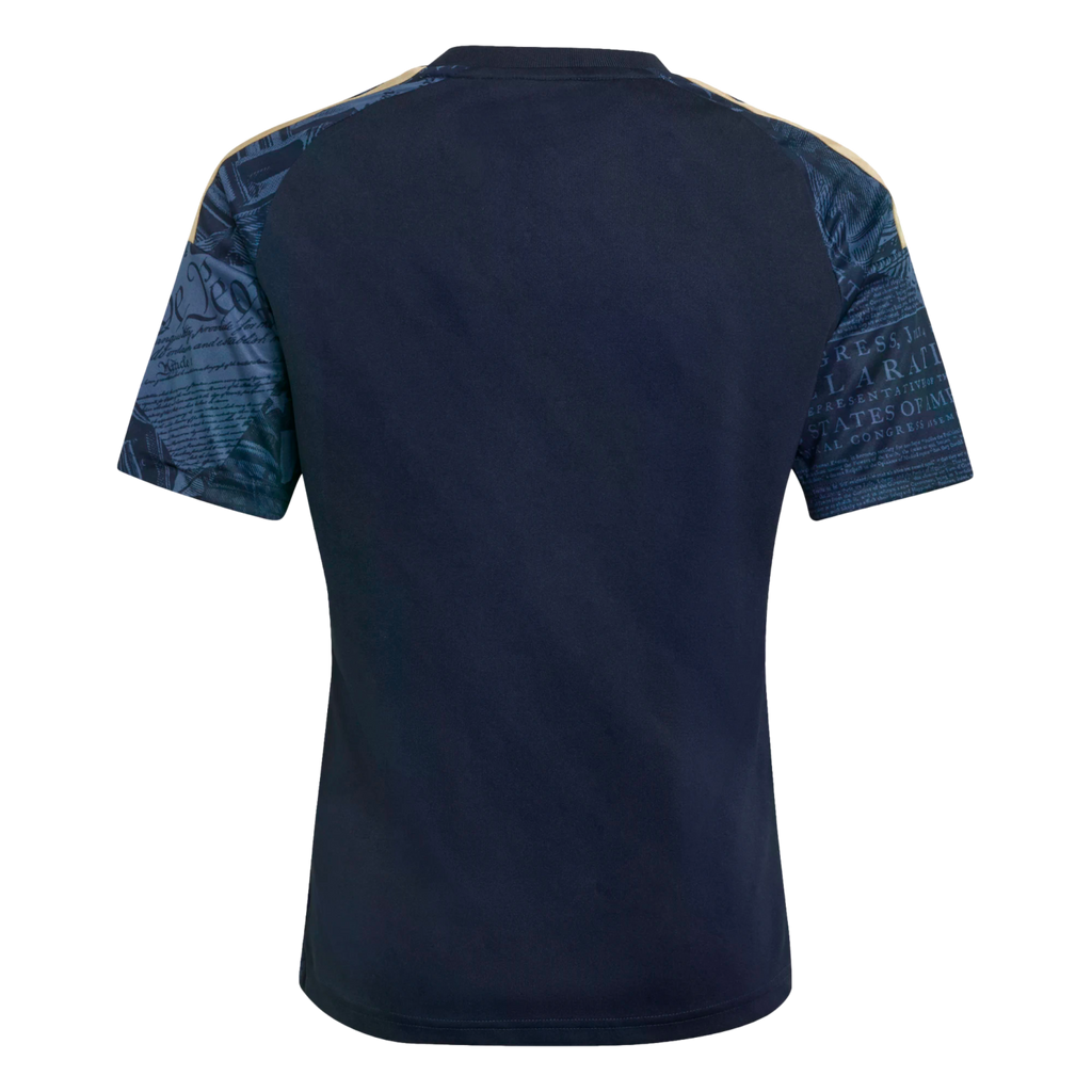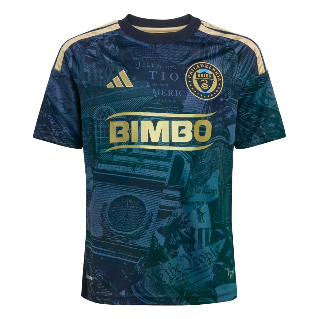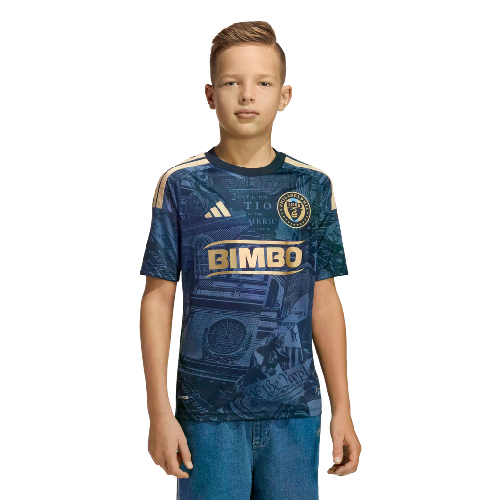 The Philadelphia Union 26/27 Home Jersey pays homage to the City of Brotherly Love and the Declaration of Independence. It features a bold graphic that is a tribute to history, inspired by 1776. Climacool technology helps your child stay cool and dry during playtime or sports practice. The moisture-wicking fabric works to keep sweat at bay for a distraction-free performance. With the iconic adidas logo and the club crest, this jersey shows off your pride and team spirit. The regular fit is comfortable and easy to move in. Whether they're on the pitch or enjoying a day out, this jersey is a top choice for showcasing their love for soccer and the city. Let them wear their passion on their sleeve and be part of the action.