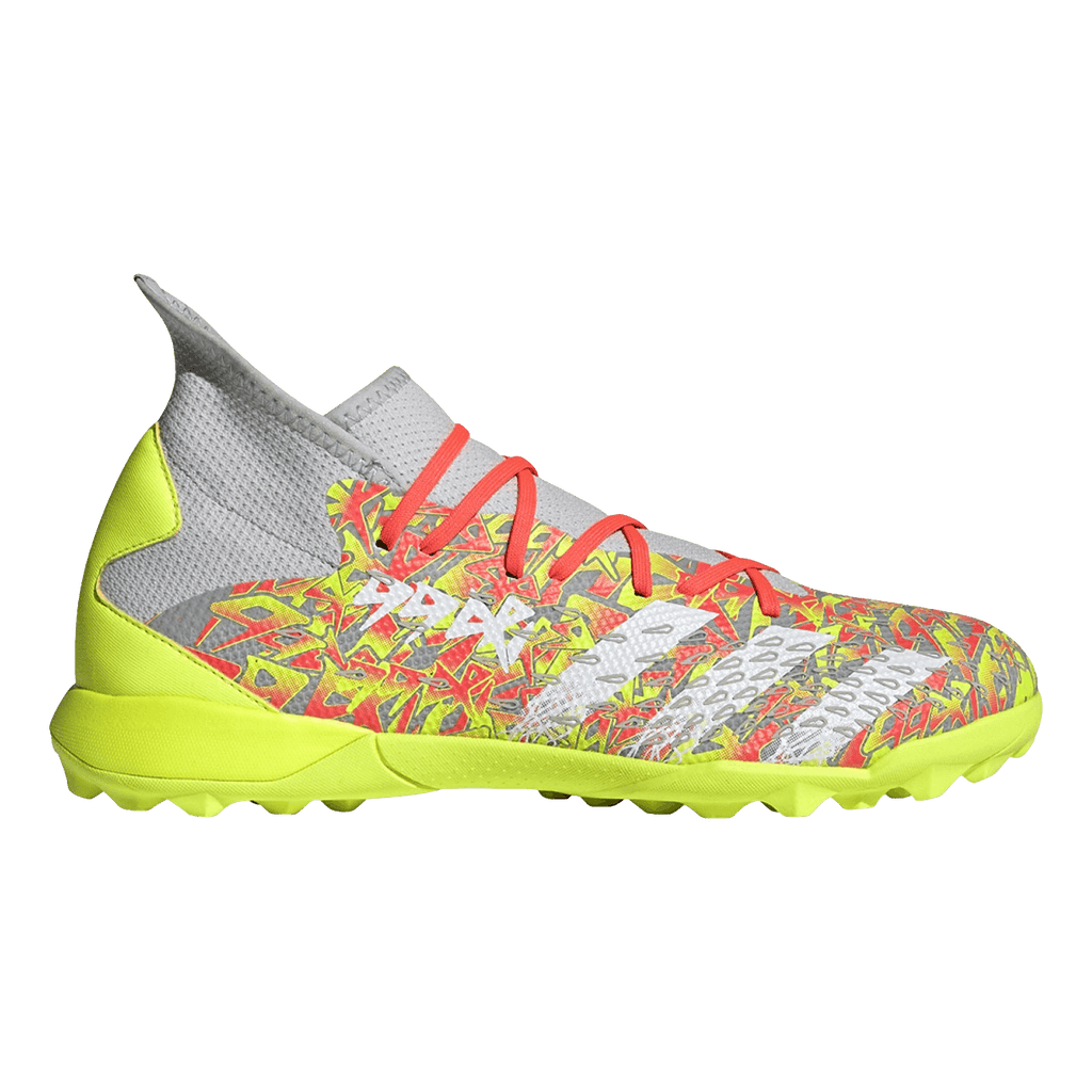 Outside these walls, it's hard to make yourself heard. But here on the court, you're in full control. Set your inner freak free in adidas Predator. You'll get into these soccer shoes easily thanks to their stretchy mono-tongue. Once they're on, the coated textile upper and supportive mid cut will help you boss games in comfort. The wide expanse of 3D-printed Demonscale elements grip the ball to keep you in charge.