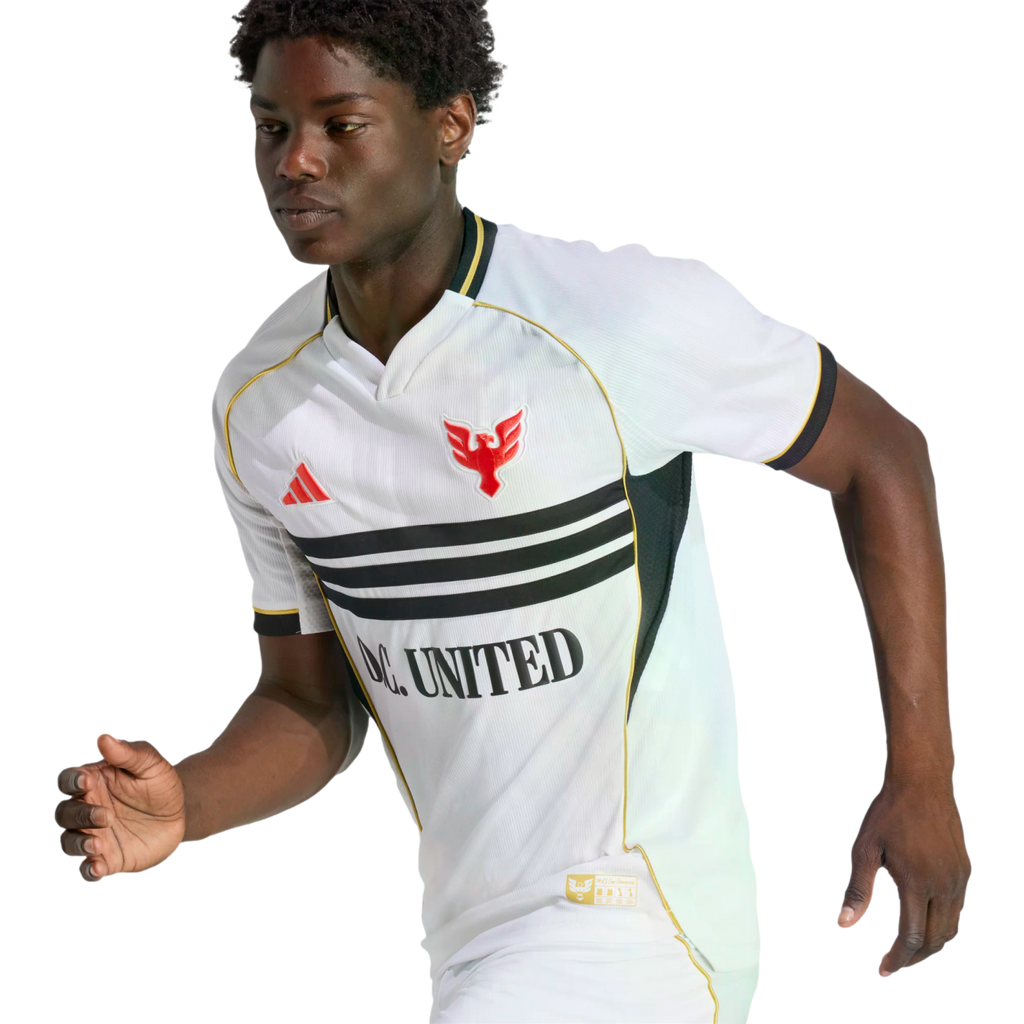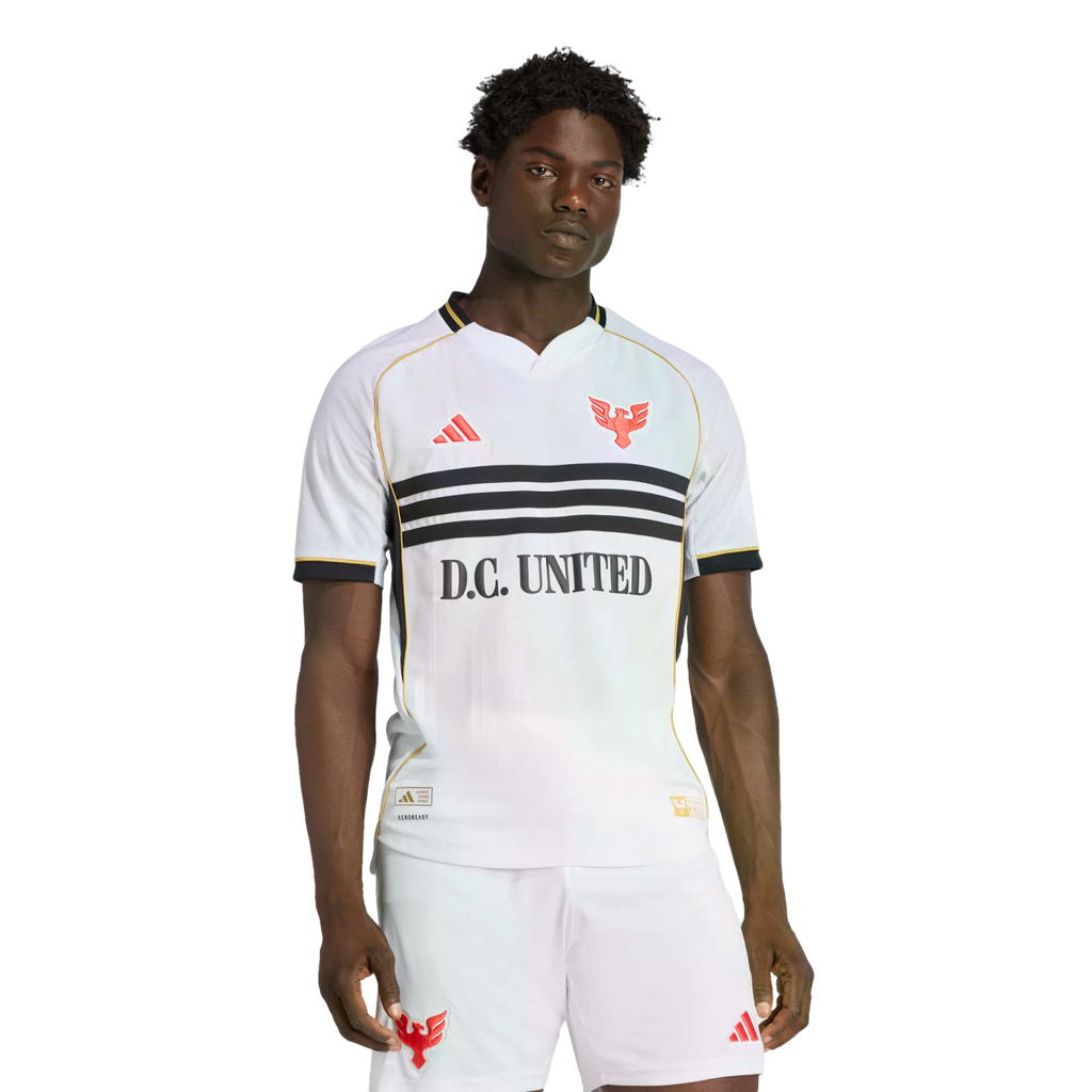 Celebrating their golden touch. This adidas third authentic jersey pays homage to D.C. United's title-winning early days. Inspired by the team's first-ever kit, it brings back those famous horizontal 3-Stripes. A secondary crest, bold team name and golden details complete the clean look. AEROREADY ensures players stay dry while they build on DCU's glittering soccer dynasty.