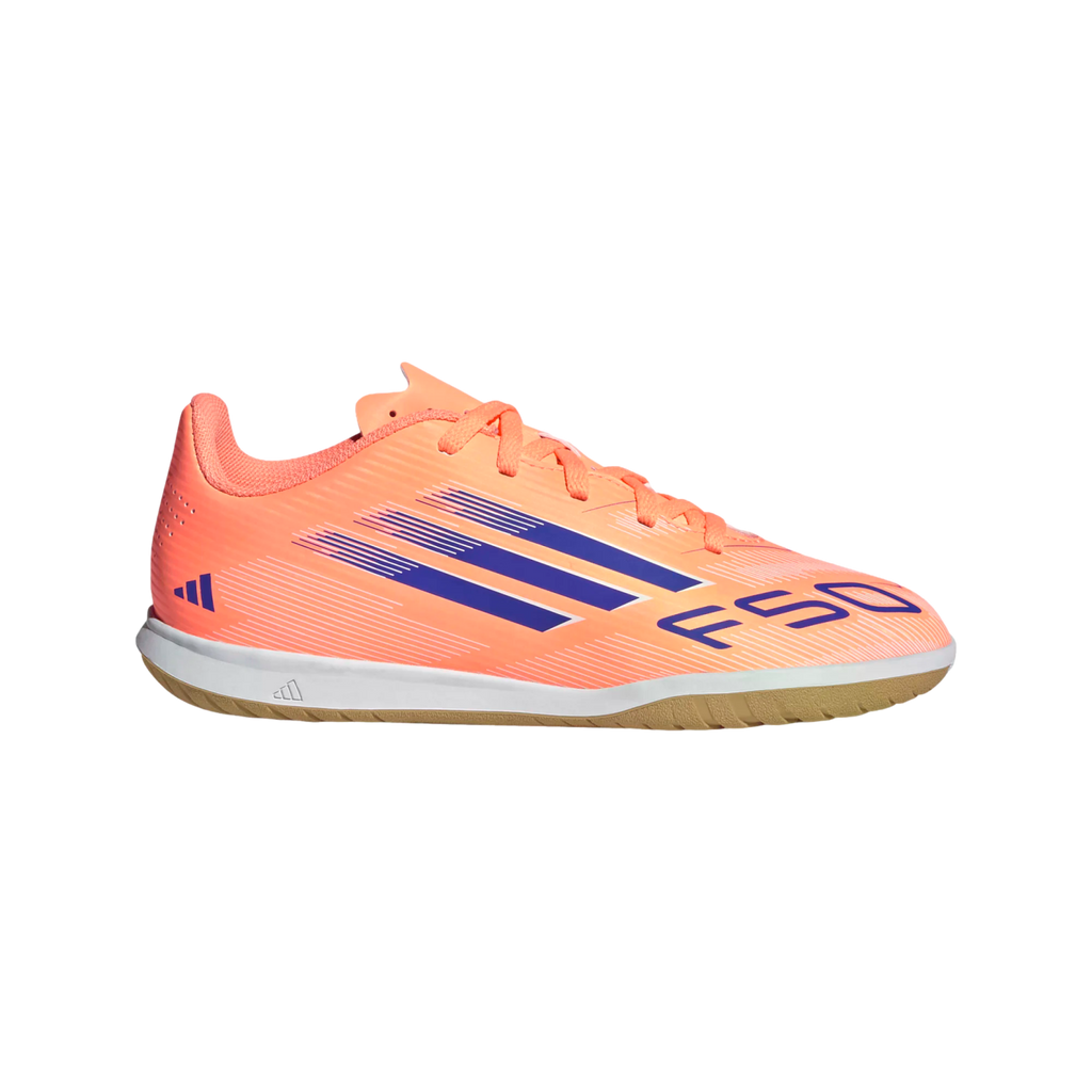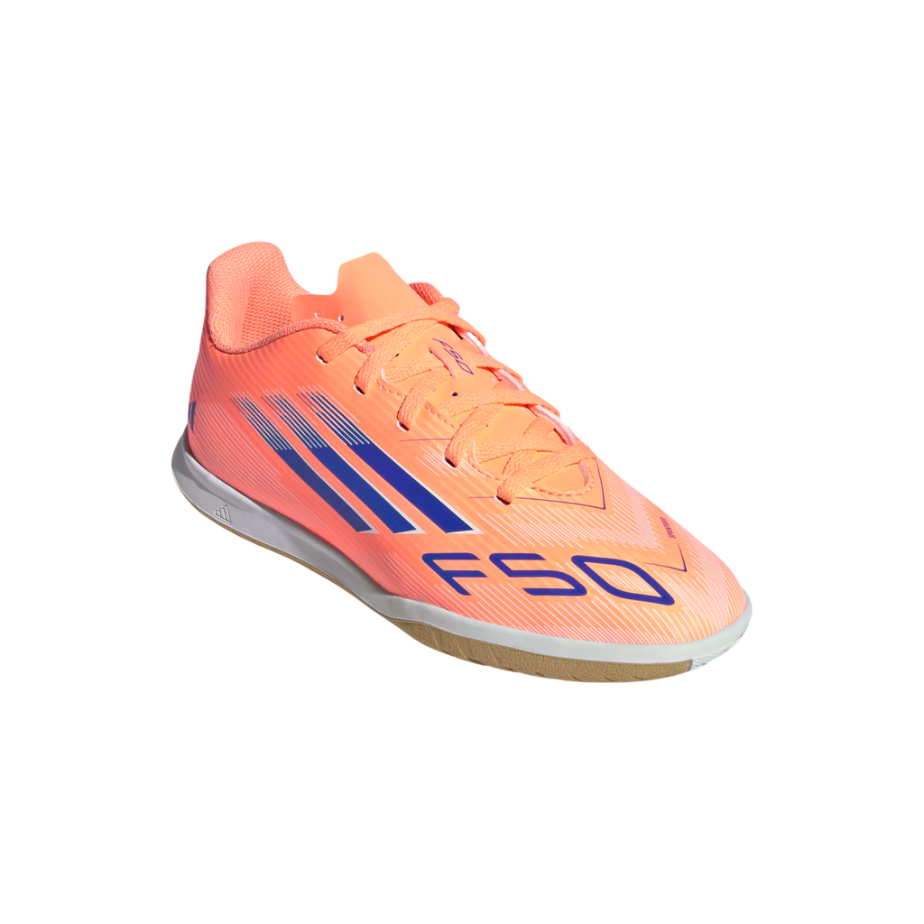 Find your fast to truly express yourself on the court. Feel the rush in adidas F50 boots engineered for speed. These juniors' Club football boots keep you comfortable on the move with a lightweight synthetic upper and perforated tongue. Turn them over and you'll find a grippy rubber outsole that supports speedy play on flat indoor surfaces.