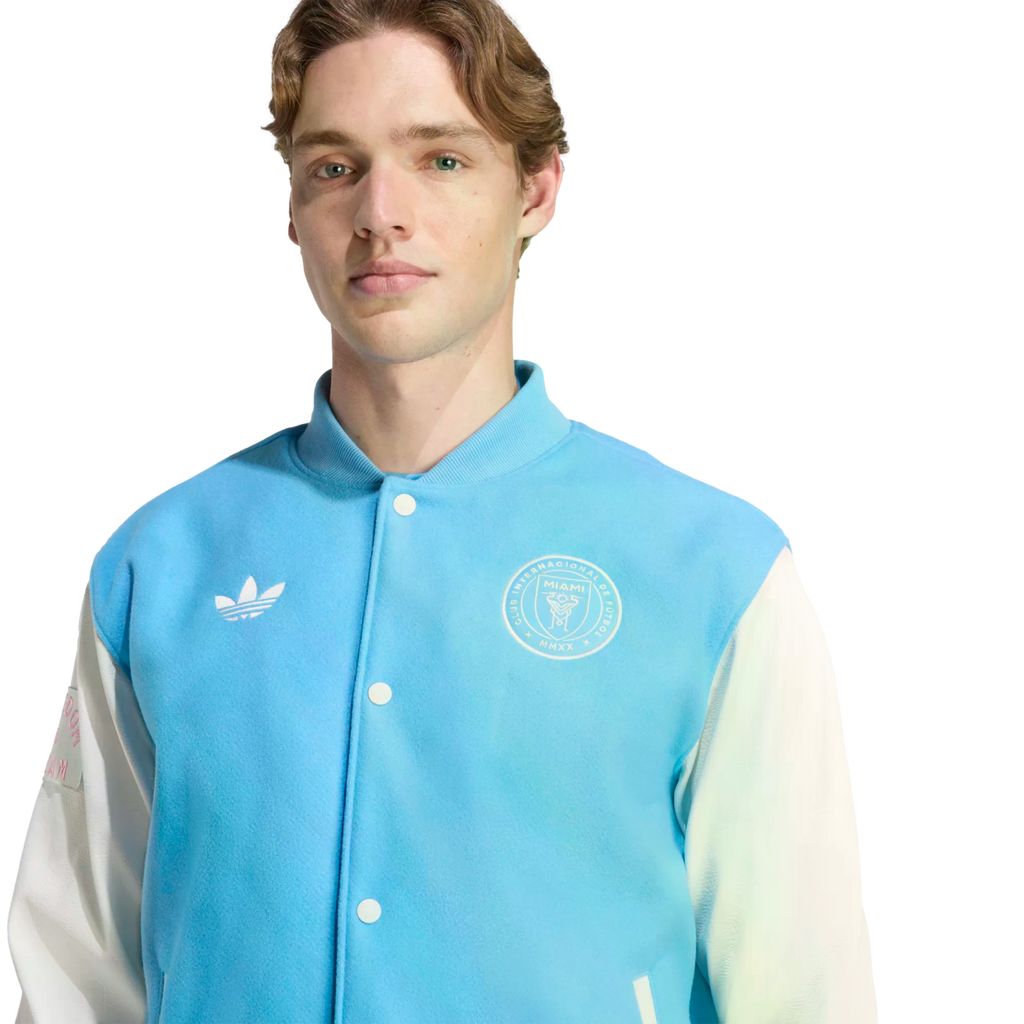 Show your Inter Miami CF pride when you're out and about. Displaying fresh colors based on the club's third kit, this adidas anthem jacket will keep you comfortable with soft single jersey and a baggy fit. An embroidered club badge on the chest and sign-offs on the sleeve and back announce your soccer fandom to everyone you meet.