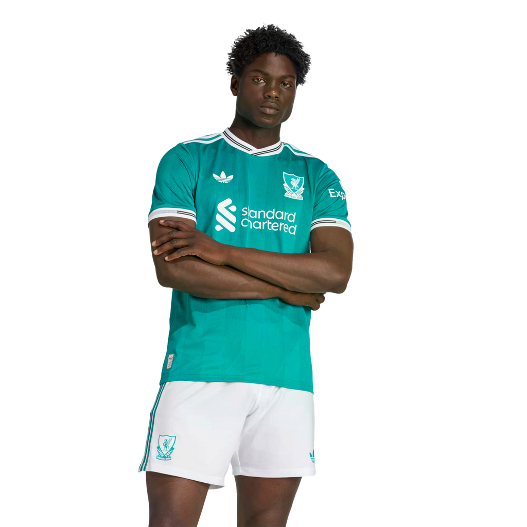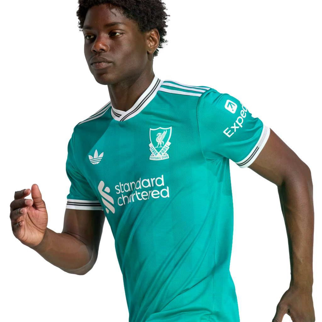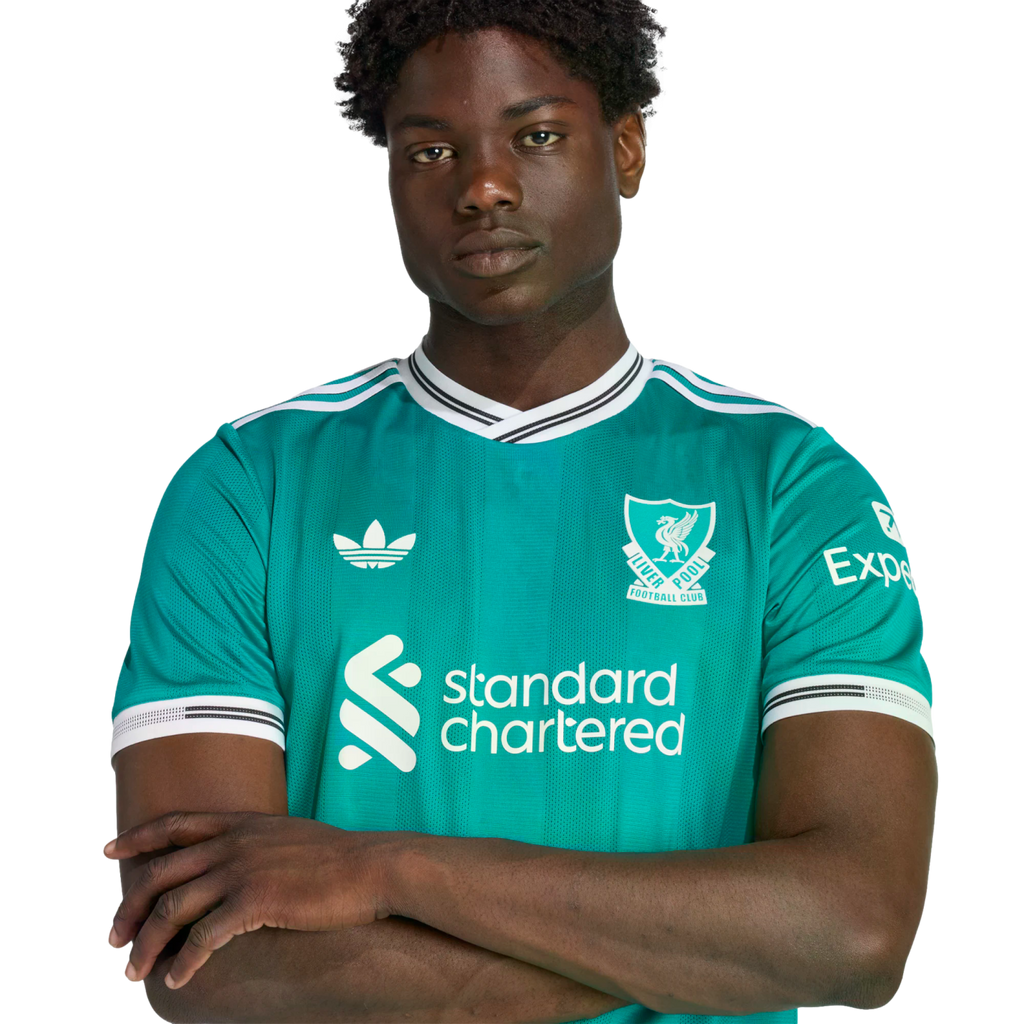 A modern soccer classic inspired by Liverpool FC's storied 3-Stripes history. The tonal vertical stripes on this elegant third authentic jersey come in unmistakable adidas Equipment green. On the chest, that vintage club badge shares the spotlight with a Trefoil for the first time since 1991. Created to collect wins on the road, this performance-focused shirt will feel as good as it looks every time you pull it on.