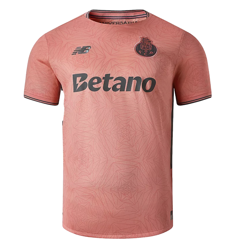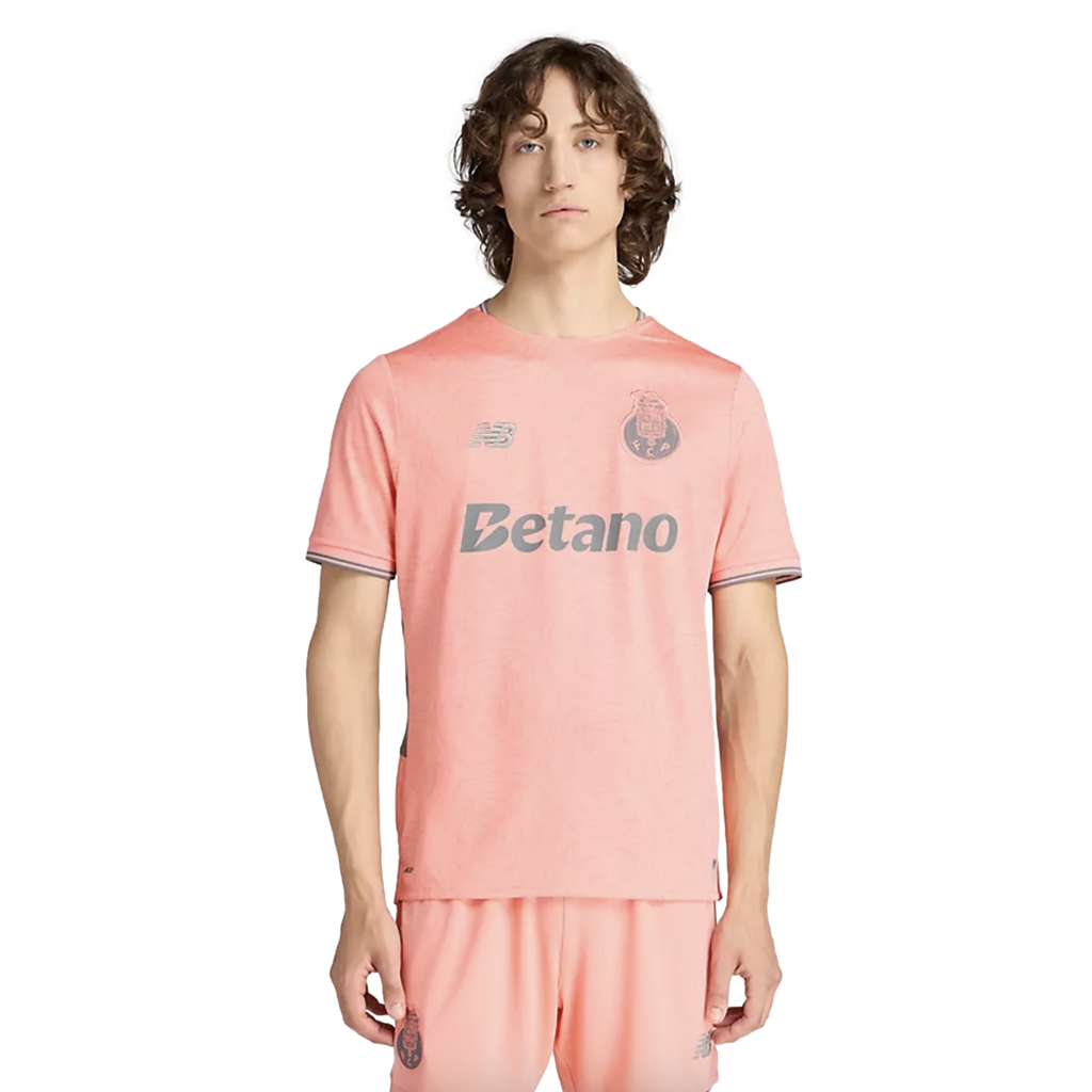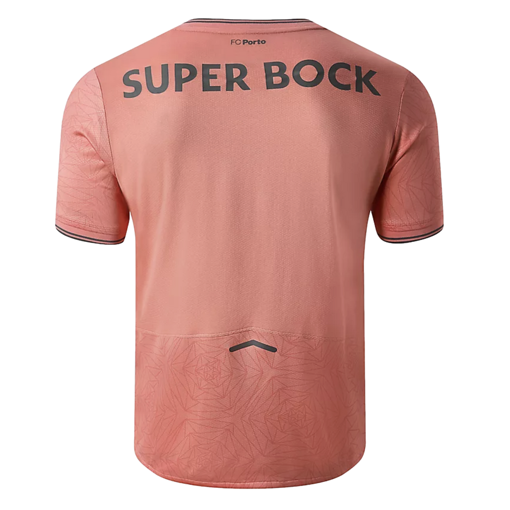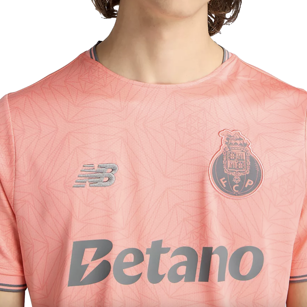 The 2025-26 FC Porto Away kit is a bold design that draws inspiration from the club’s passionate supporters. A striking shade of ‘sunfade’ pink features an all-over geometric print, with the club badge, numbers, branding, and sponsor logos rendered in slate grey. This color and graphic interplay is an abstract take on the unforgettable atmosphere surrounding the game’s biggest moments.
