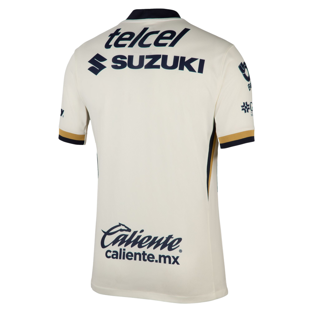 The Pumas UNAM 2025/26 Home kit is a love letter to their legendary stadium. The white base represents the stadium's raw materials while the custom typeface is inspired by the entrance to the grounds. Obsidian and gold accents round out this celebration of their iconic home.
