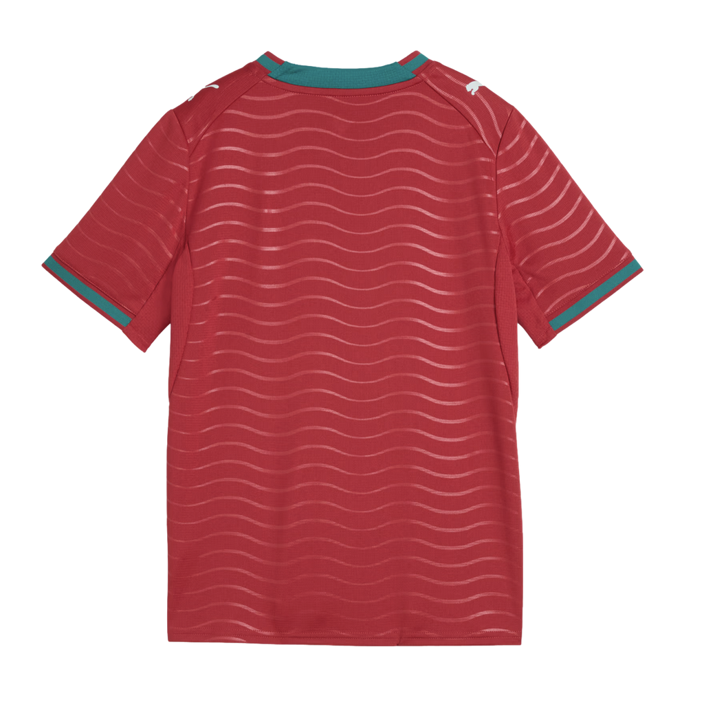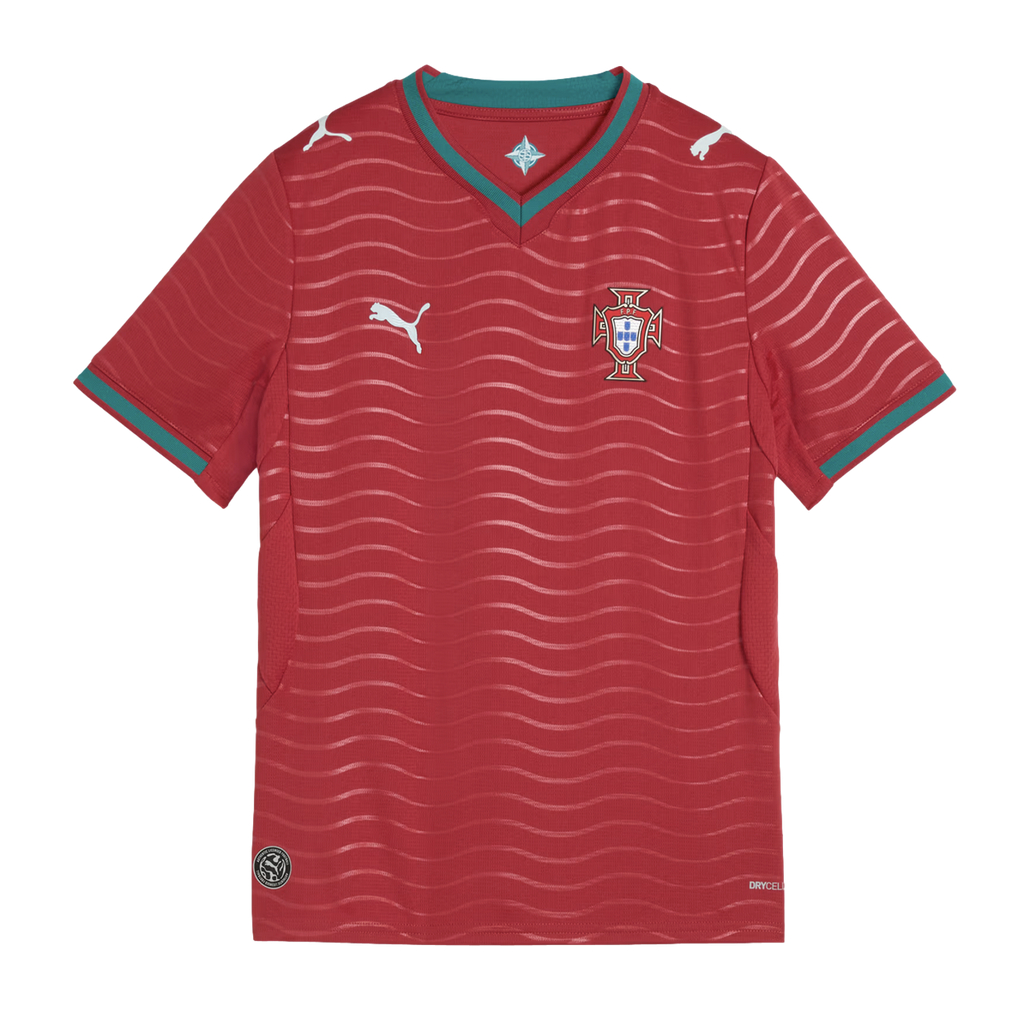 Portugal’s Home Kit channels the energy of the ocean and the intensity of a team ready to make waves on the biggest stage. The iconic red base is layered with a wavy pattern and green accents, a nod to the country’s maritime roots and fearless spirit. It’s a design that speaks to those who were born to explore and live to play por amor à camisola. Designed for the fans, this Replica jersey pairs the same match-worn look with a casual silhouette, details, and materials, ideal for both game day and everyday wear.