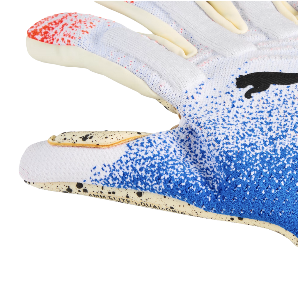 Unleash your inner soccer goalkeeper with PUMA's latest gloves. Featuring 4mm ELITE+ DUAL GRIP 2.0 palm latex, a knitted backhand, and latex finger gussets, these gloves offer unparalleled grip, fit, and control. Get ready to own the goal.